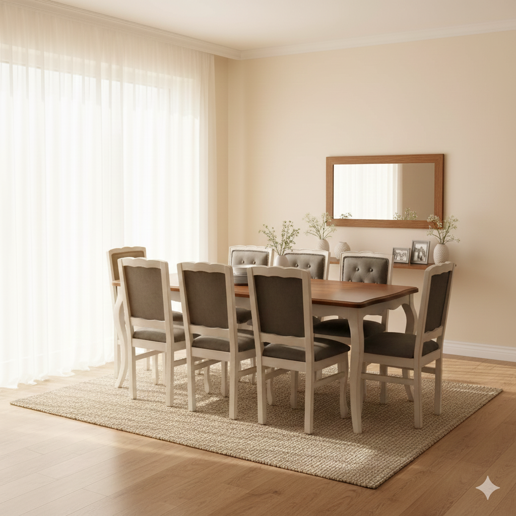Este elegante Comedor Estilo Normando es la pieza perfecta para quienes buscan un ambiente que combine sofisticación y funcionalidad. Con un diseño clásico y atemporal, este comedor se adapta a cualquier espacio, aportando un toque de distinción y calidez que lo convierte en el centro de atención de tu hogar.