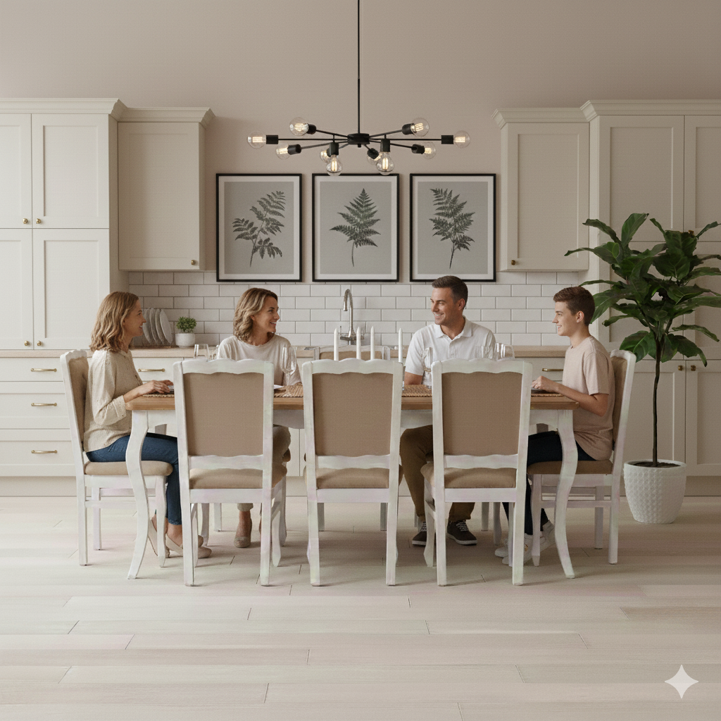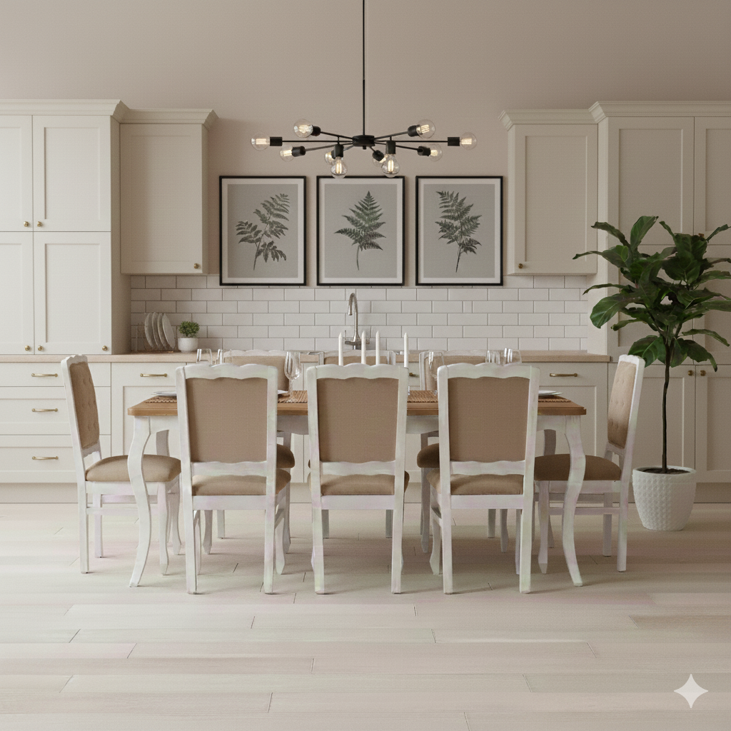 Descripción: Este elegante comedor en estilo normando destaca por su diseño clásico y atemporal, ideal para quienes buscan una pieza que combine sofisticación y funcionalidad.