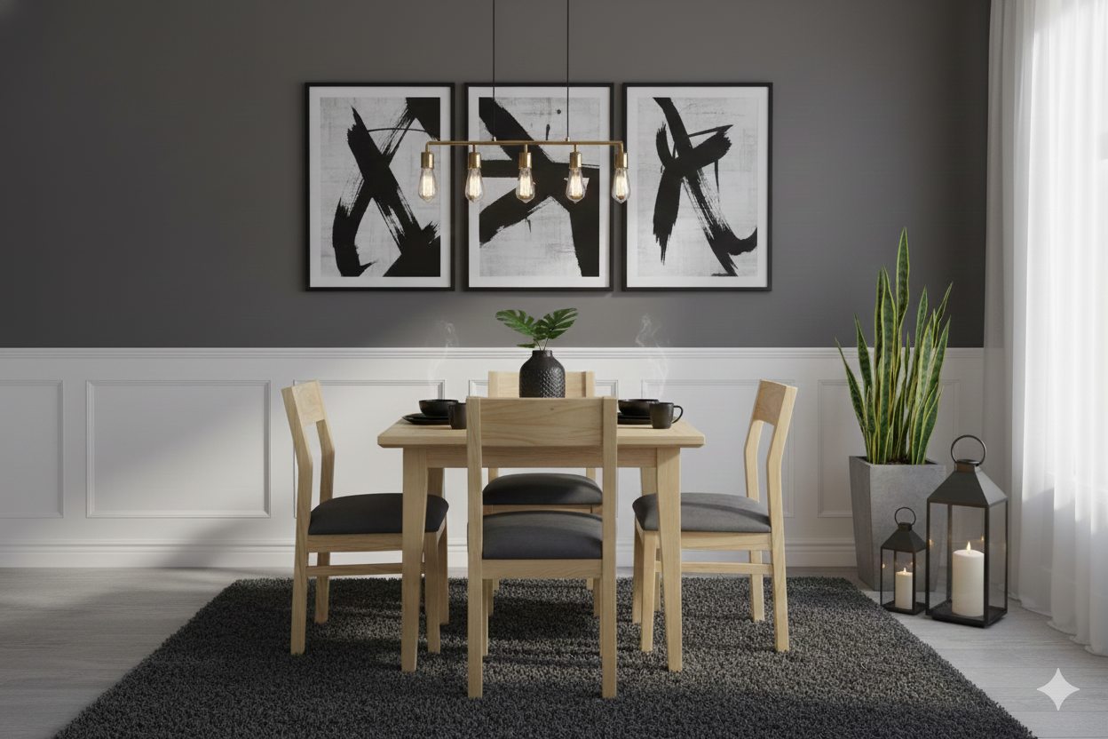 - Sillas: Cuatro sillas tapizadas en un elegante tono gris, diseñadas para brindar confort y estilo.